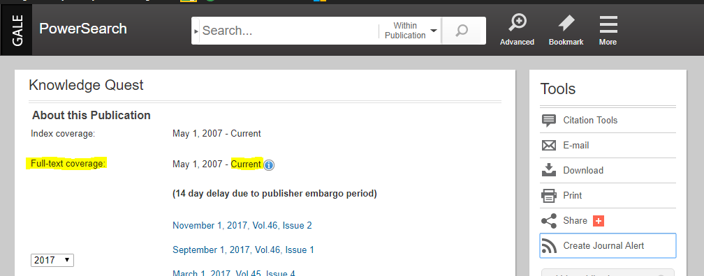 Did you know that you can set up journal alerts for periodicals available in the Gale databases? After setting up a journal alert for a specific periodical, you will receive an email or RSS feed notification when Gale adds new content from that publication. At the very bottom of this email, there is an example of an alert I received for the AASL journal, Knowledge Quest. The alert email includes a preview list of 5 linked articles plus a link to all of the articles for the periodical, starting with the most recent.