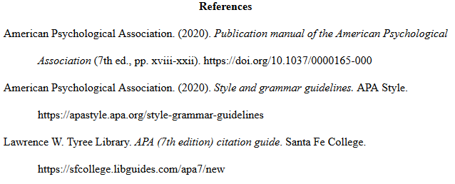 Lawrence W. Tyree Library. APA (7th edition) citation guide. Santa Fe College. https://sfcollege.libguides.com/apa7/ew